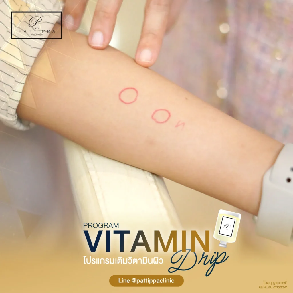 - แพทย์ดูแลอย่างใกล้ชิด – โปรแกรม Drip Vitamin ที่ Pattippa Clinic ได้รับการดูแลจากแพทย์ที่คอยให้คำแนะนำในการเลือกสูตรวิตามินที่เหมาะสมกับความต้องการของแต่ละบุคคลและมีการทำ allergy skin prick test เพื่อดูว่ามีสิทธิแพ้ยาไหม