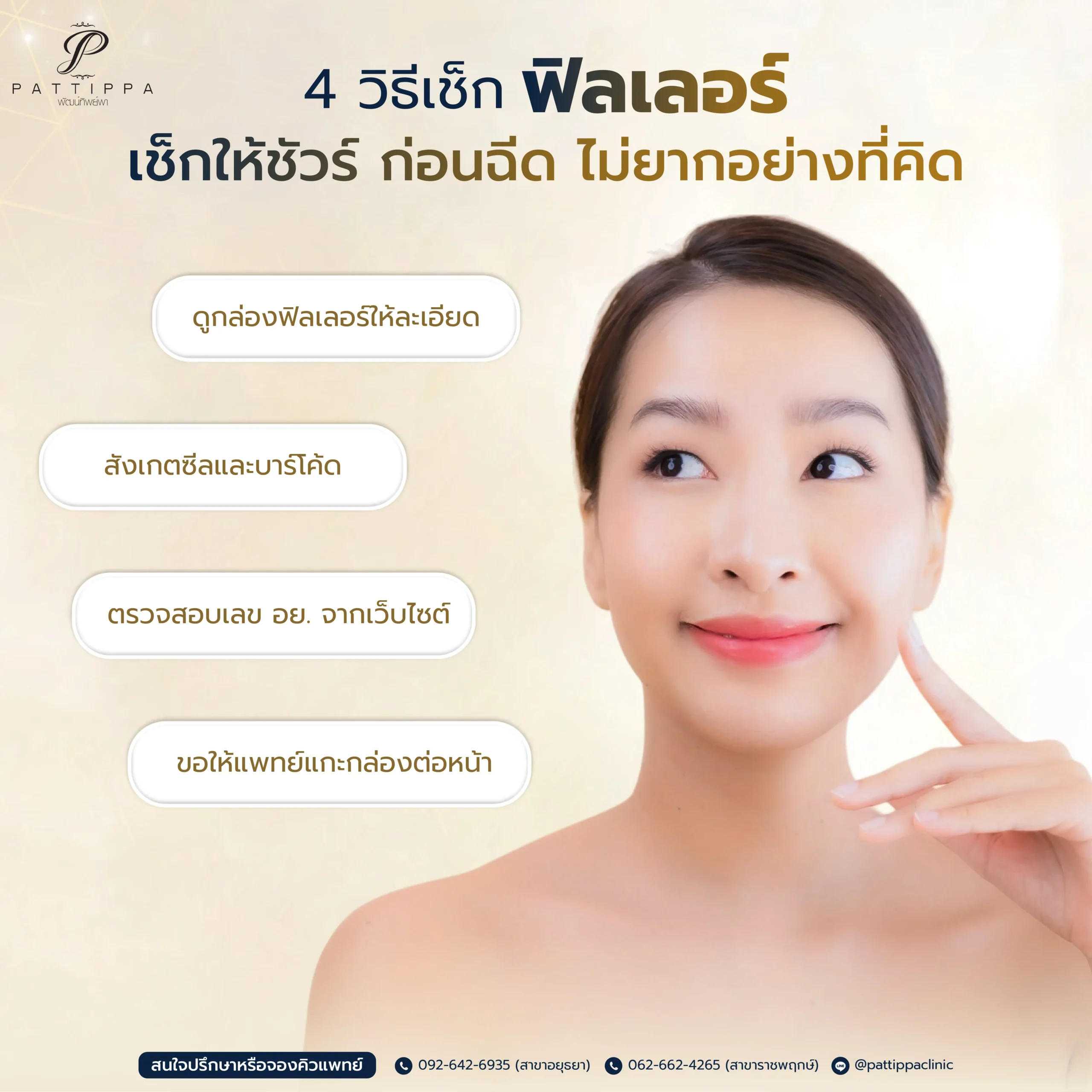 ดังนั้น การตรวจสอบว่า โปรแกรมฟิลเลอร์ที่เราจะเลือกใช้ เป็นโปรแกรมฟิลเลอร์แท้และได้มาตรฐานจึงเป็นสิ่งที่ไม่ควรมองข้าม ในบทความนี้ Pattippa Clinic จะพาทุกคนไปดูวิธีการเช็กโปรแกรมฟิลเลอร์แท้อย่างง่าย ๆ ที่ทุกคนสามารถทำได้ด้วยตัวเอง เพื่อให้แน่ใจว่าใบหน้าของผู้เข้ารับบริการจะได้รับการดูแลอย่างดีที่สุด ไม่ถูกหลอกและผลลัพธ์ที่แลดูเป็นธรรมชาตินั่นเอง