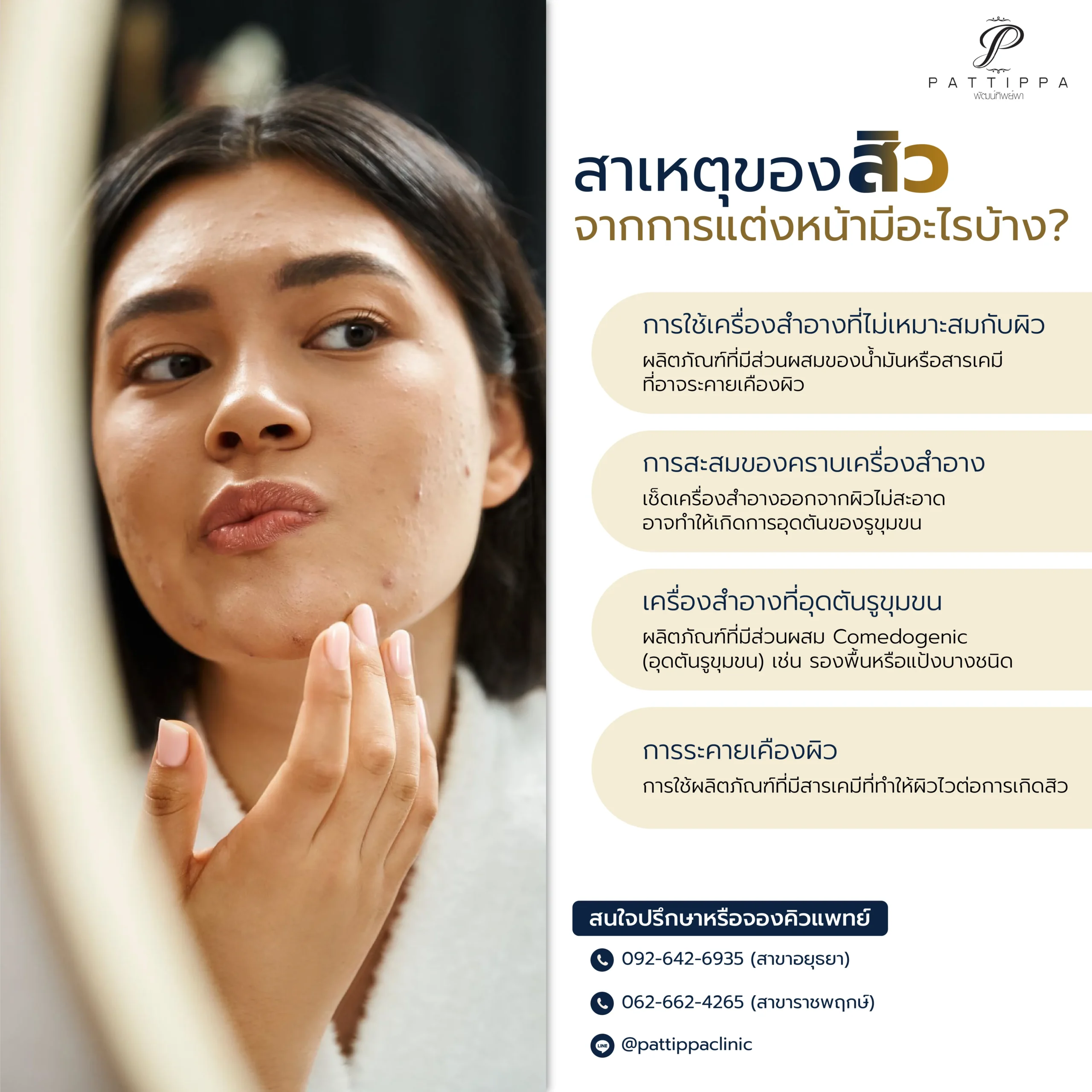 จากที่กล่าวไปข้างต้นว่า การแต่งหน้าอาจดูเหมือนเป็นการเพิ่มความสวยงามให้กับใบหน้า แต่หากเราไม่ระวังในการเลือกใช้ผลิตภัณฑ์ที่เหมาะสมกับผิว หรือไม่ทำความสะอาดอย่างละเอียดหลังการแต่งหน้า อาจทำให้เกิดสิวได้ง่ายขึ้น โดยที่หลายคนอาจไม่ทราบถึงสาเหตุที่ทำให้สิวเกิดขึ้นจากการแต่งหน้า ซึ่งปัจจัยเหล่านี้สามารถทำให้เกิดปัญหาผิวที่ไม่พึงประสงค์ได้