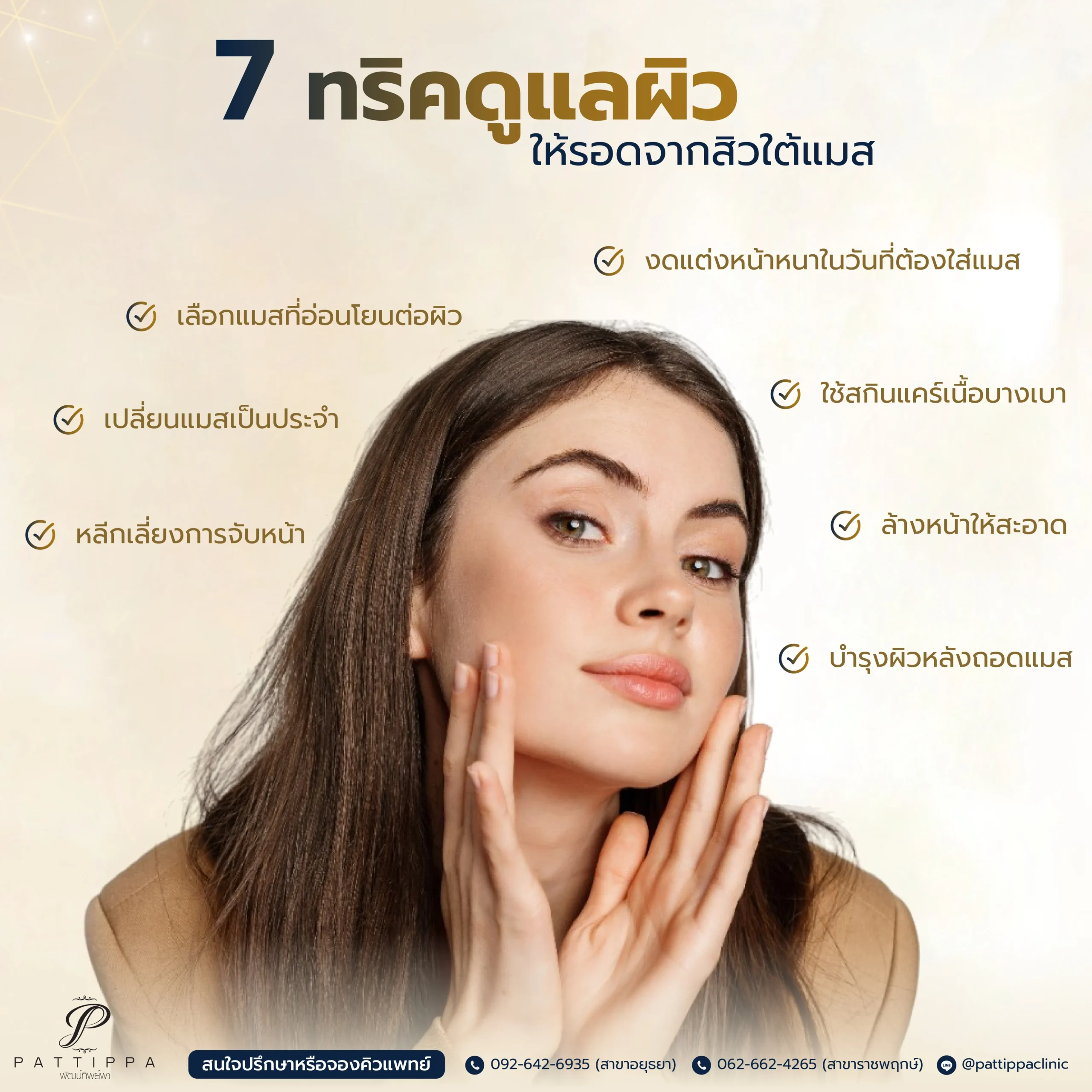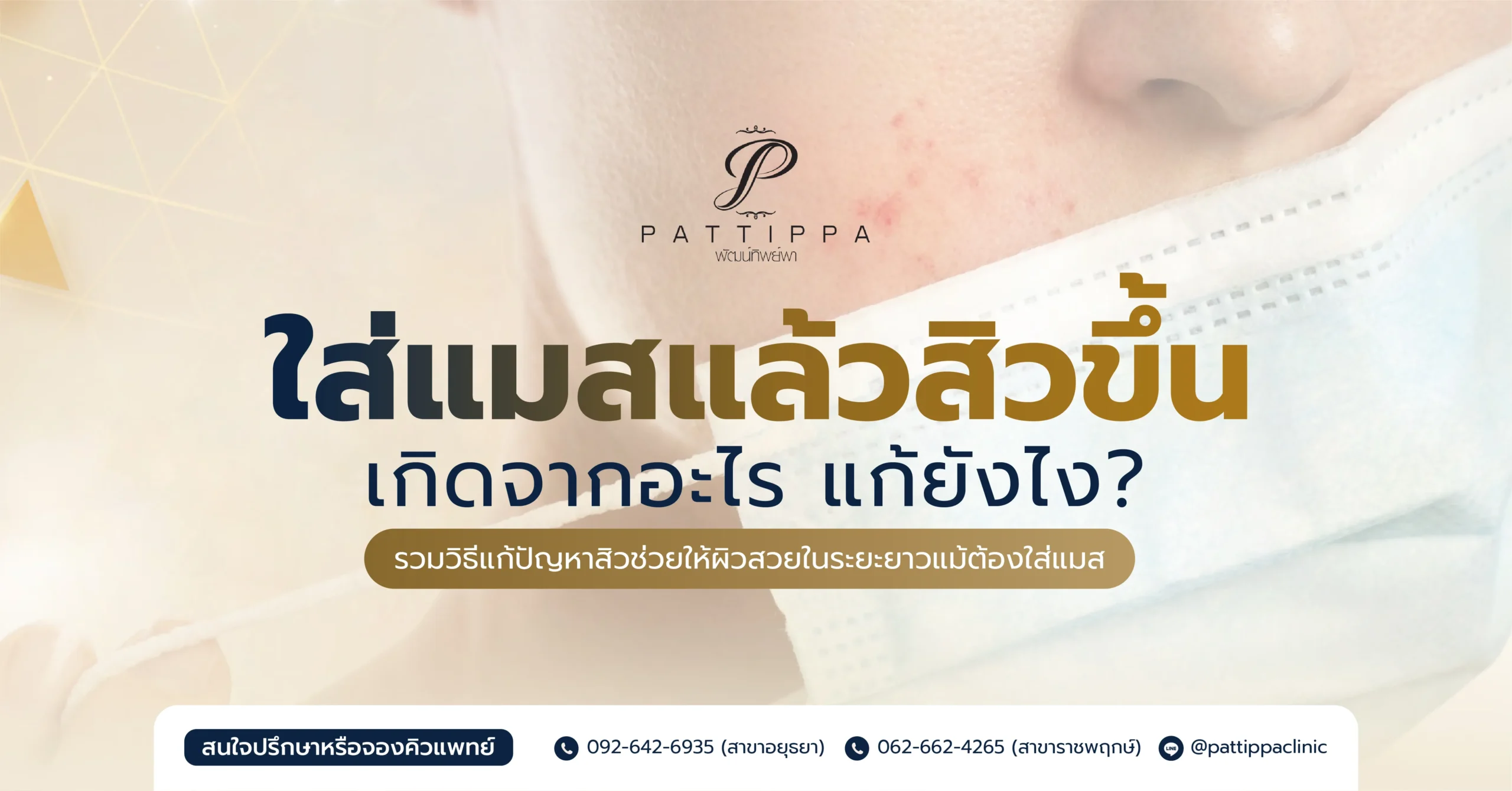 สำหรับใครที่กำลังเผชิญปัญหานี้อยู่ ในบทความนี้ Pattippa Clinic ได้รวบรวมวิธีดูแลผิวเพื่อป้องกันและรับมือกับสิวจากแมสไว้ให้แล้ว พร้อมเคล็ดลับง่าย ๆ ที่ทำได้จริง เพื่อให้ผิวของผู้ประสบปัญหาสิวให้กลับมาแข็งแรงและมั่นใจได้อีกครั้ง แม้ต้องใส่แมสทุกวันก็ตาม