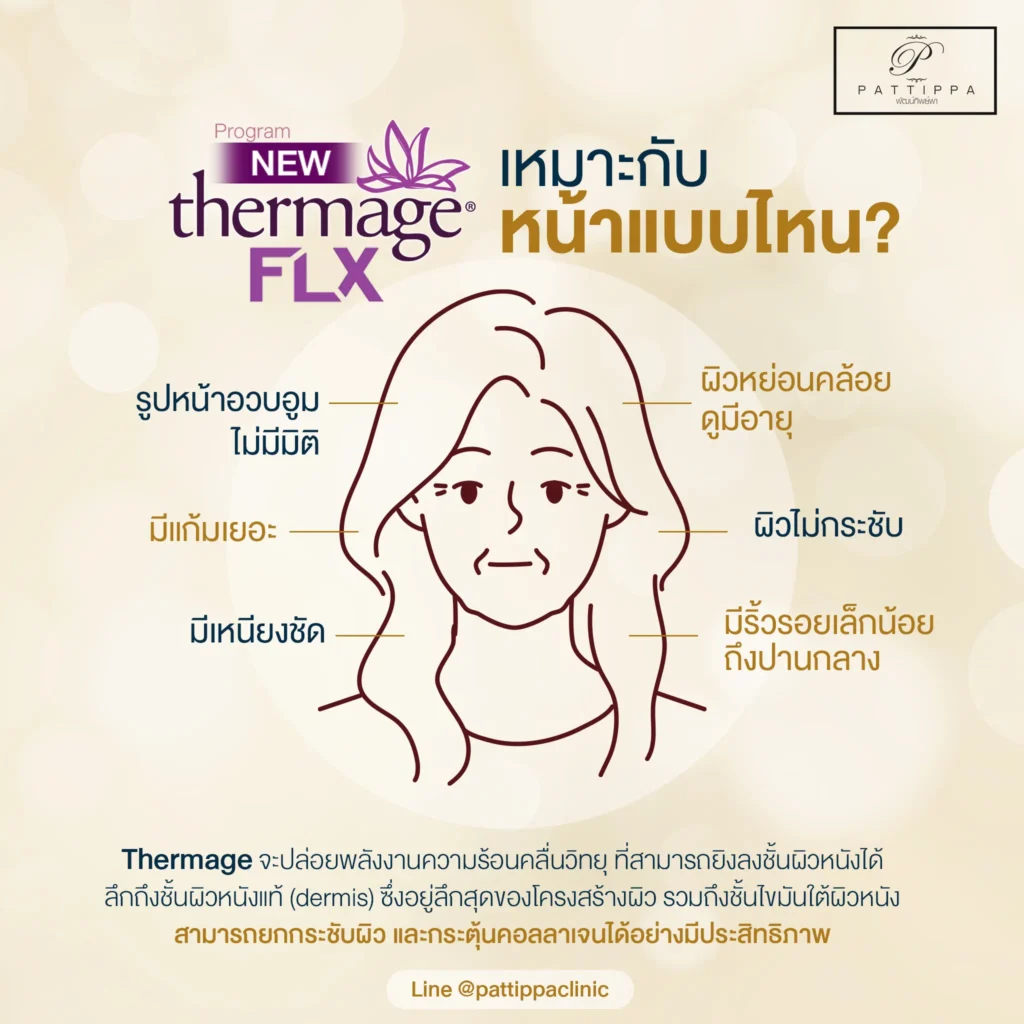 • ลดไขมันสะสมใต้ผิวหนัง โปรแกรม Thermage  เหมาะมากกับผู้ที่มีไขมันเยอะ หน้าเต็ม Thermage ตอบโจทย์สุด ๆ แต่ถ้าใครที่หน้าตอบไม่ค่อยมีชั้นไขมันแต่มีปัญหาผิวหย่อนคล้อย แนะนำว่าให้ลองดูเทคโนโลยีอื่น ๆ อย่าง โปรแกรม Ulthera เป็นต้น