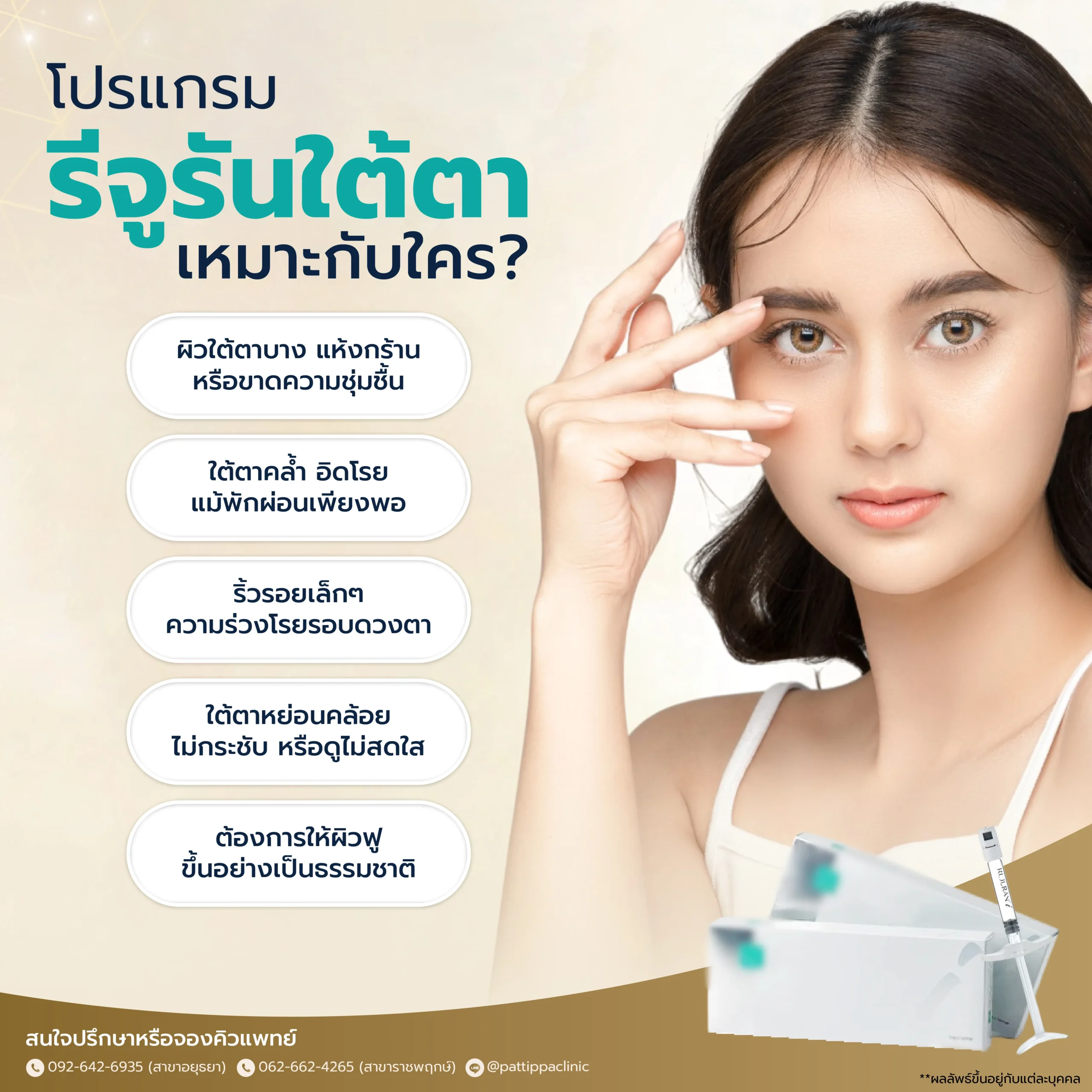 ก่อนต้องแจ้งก่อนว่าโปรแกรมรีจูรันใต้ตาไม่ได้เหมาะสำหรับทุกคน แต่จะให้ผลลัพธ์ที่ดีเยี่ยมที่สุดเมื่อเลือกใช้กับกลุ่มคนที่มีปัญหาเฉพาะเจาะจงเกี่ยวกับผิวรอบดวงตา ซึ่งมักเป็นปัญหาที่ไม่สามารถแก้ไขได้ด้วยการทาครีมหรือการพักผ่อนเพียงอย่างเดียว โดยเฉพาะผู้ที่ต้องการฟื้นฟูผิวในเชิงลึก ให้กลับมาแข็งแรงและดูสุขภาพดีจากภายใน การฉีดรีจูรันใต้ตาจึงถือเป็นทางเลือกที่ตอบโจทย์อย่างยิ่ง
