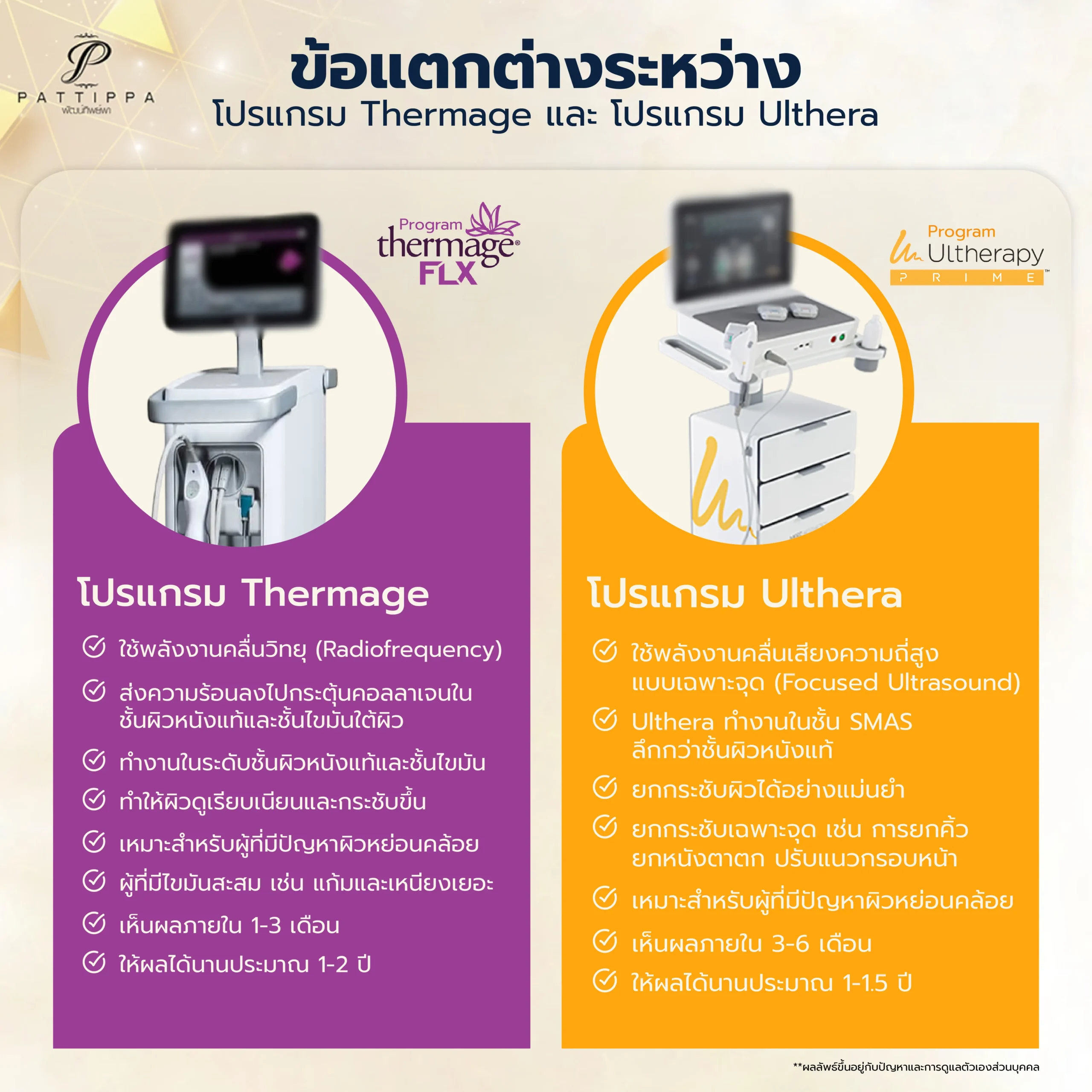 โปรแกรม Thermage และ โปรแกรม Ulthera มีความแตกต่างกันอย่างชัดเจนทั้งในด้านเทคโนโลยีที่ใช้ ชั้นผิวที่ทำงาน และลักษณะของผลลัพธ์ที่ได้