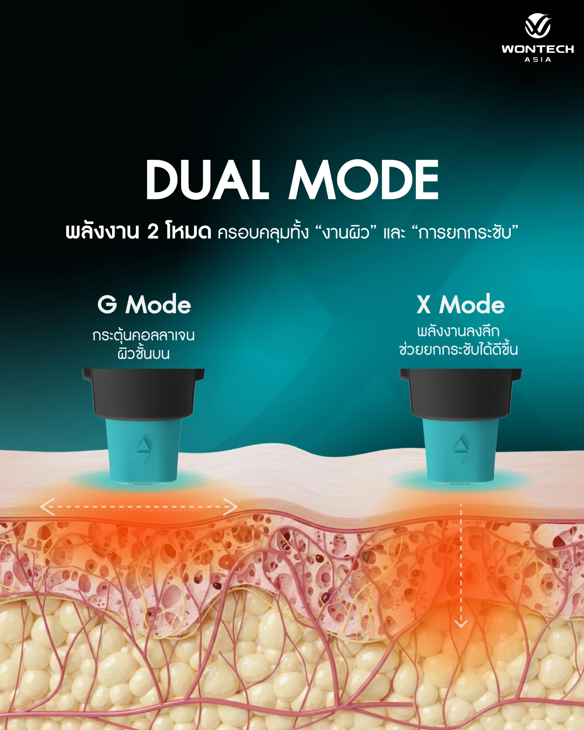 - X Mode (Powerful Deep Heat) : โหมดพลังงานเข้มข้น ส่งความร้อนลงลึกถึงชั้นหนังแท้ล่างและเนื้อเยื่อไขมันใต้ผิว เพื่อให้เกิดการหดตัวของคอลลาเจนและไขมันอย่างเข้มข้น